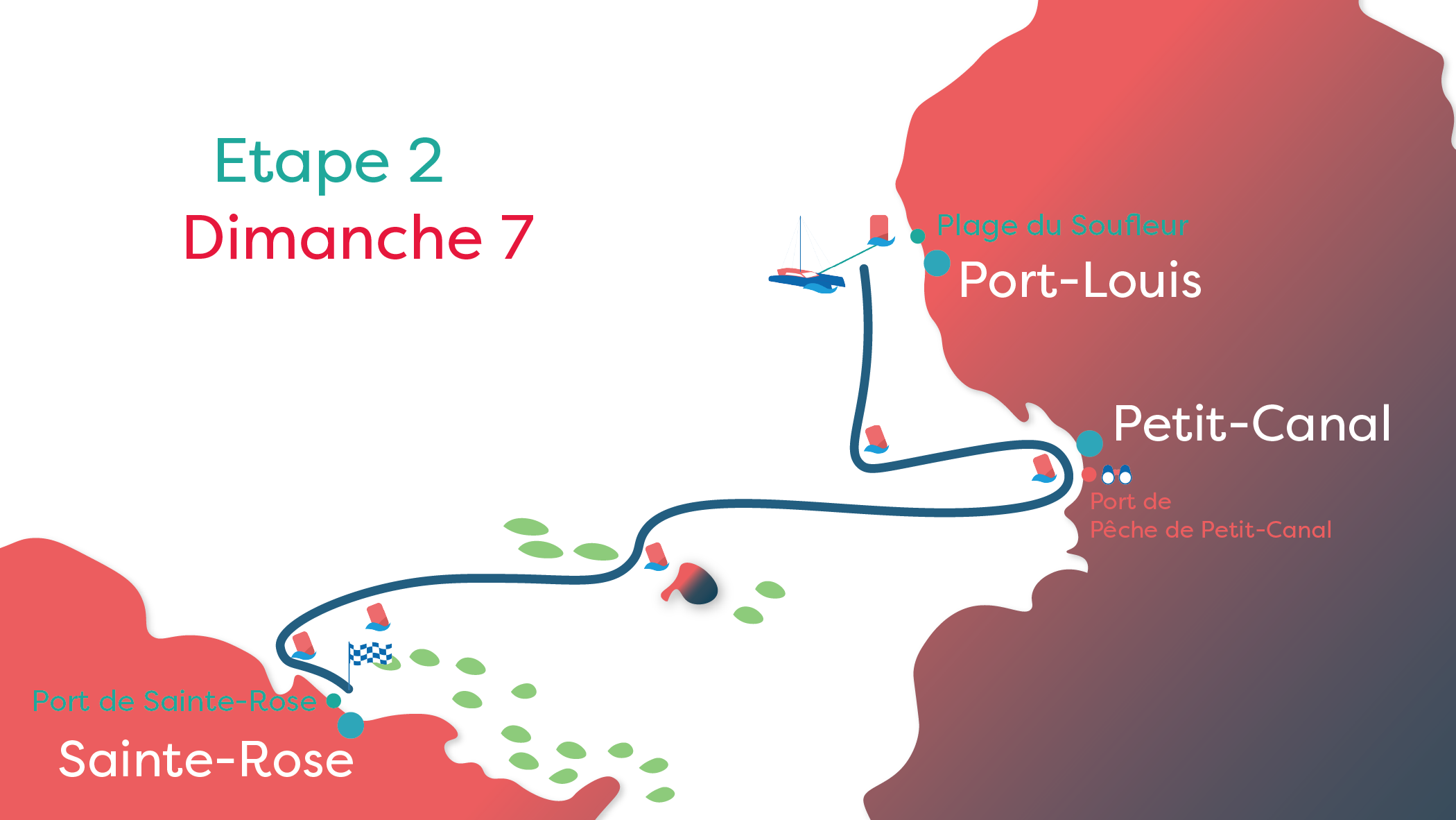 La deuxième étape consiste en une navigation plutôt paisible dans le Grand Cul-de-Sac Marin. Le départ se fera de Port-Louis en direction du port de pêche de Petit-Canal, en passant par une bouée placée au plus près du rivage pour le bonheur des spectateurs. Ensuite, les équipages se dirigeront plein ouest vers Sainte-Rose, en traversant le mythique Cul-de-Sac Marin de la Guadeloupe. Ils contourneront deux bouées au large de Sainte-Rose avant d'arriver devant le port de la ville.