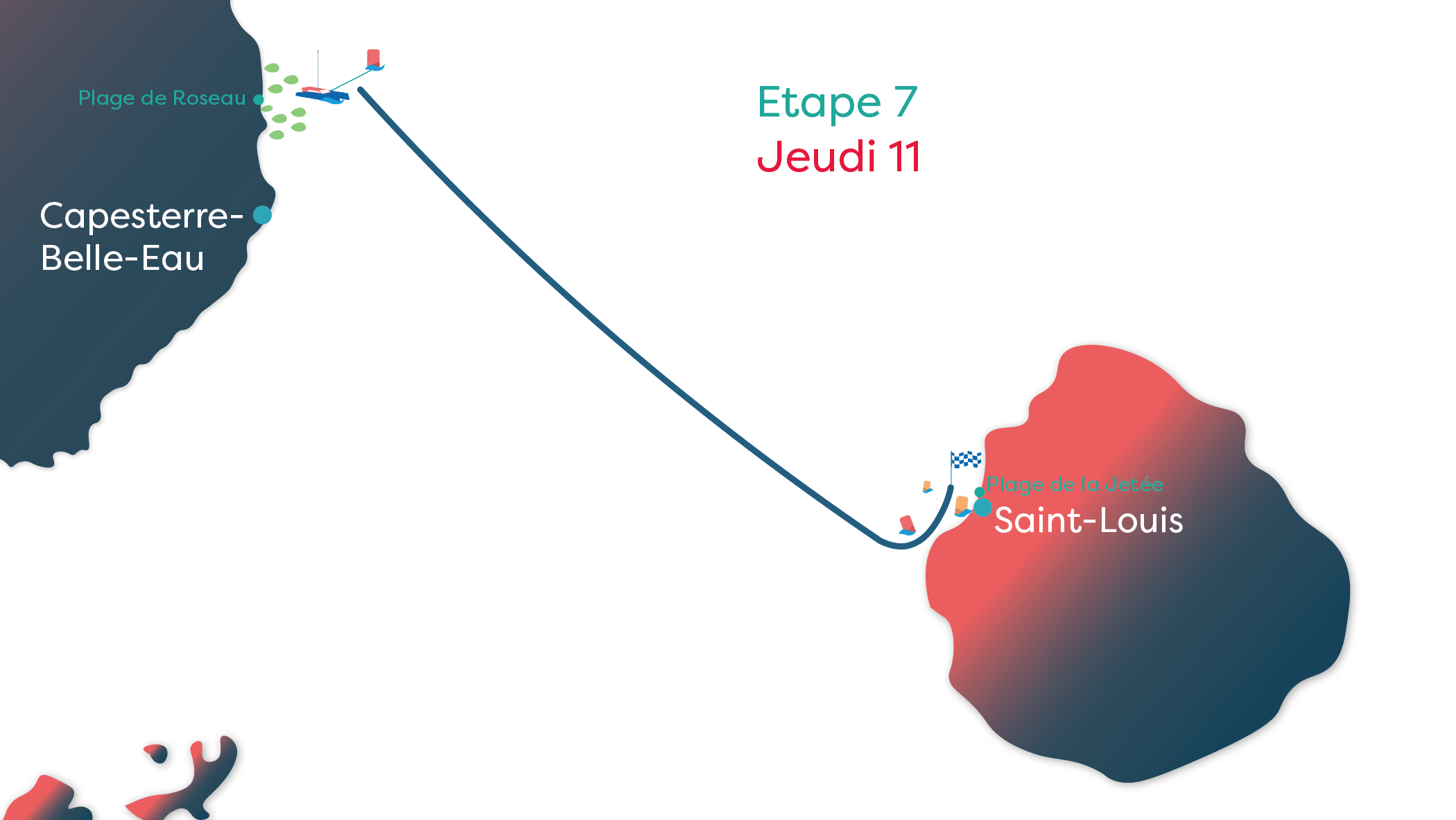 À leur arrivée à Marie-Galante, les équipages devront laisser une bouée à bâbord au niveau de la Pointe de Folle Anse avant de franchir la porte du RIPAJ (Vous ne savez pas ce qu'est le RIPAJ ? Cliquez, je vous explique tout !). L'arrivée de cette étape se fera sur la plage de la Jetée à Saint-Louis de Marie-Galante.