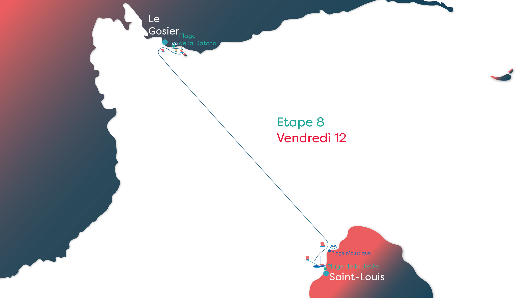 Défi de cette étape : retour en Grande-Terre, direction la ville du Gosier. Les équipages ne devraient pas rencontrer de grandes difficultés pour rejoindre le Gosier, la direction du vent étant très favorable. Ce qui fera la différence sur cette étape, c'est la capacité des équipages à maintenir l’équilibre du canot et à prendre les vagues correctement. C'est une traversée longue mais relativement reposante.